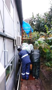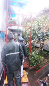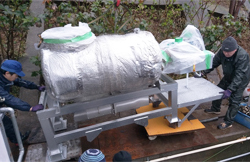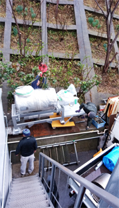トラックからクレーンで荷下ろし、そして雨の中でも搬入作業が、行われました。