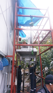 クレーンの入らない場所でも、チェーンブロックで持ち上げ作業が、始まりました。