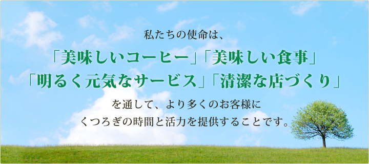 当社は、創業以来「一杯の美味しいコーヒーを通して、お客様にやすらぎの時間と活力を提供する。」という基本理念のもと、お客様第一主義を徹底し、お客様にやすらぎと活力を感じていただける商品の品質、店舗の雰囲気、接客のレベルを高めることに努めてまいりました。